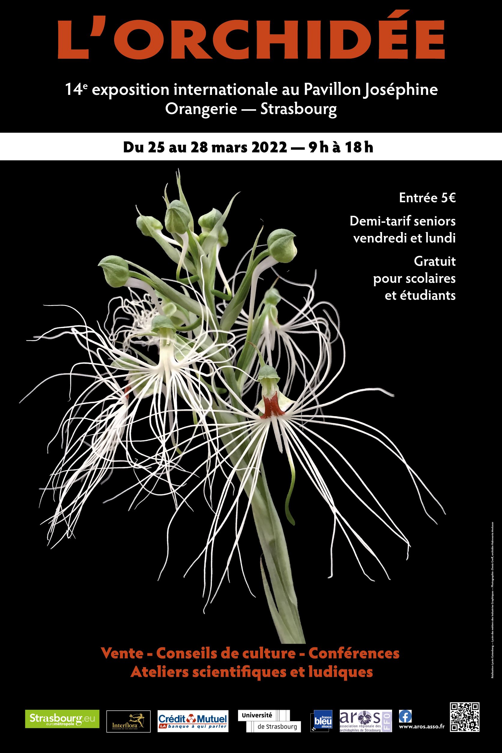 L'Association Régionale des Orchidophiles de Strasbourg, des jardins botaniques, des producteurs de renommée internationale et des associations d'orchidophiles vous présentent des centaines d'orchidées botaniques et hybrides dans les prestigieux salons du Pavillon Joséphine du parc de l'Orangerie,transformés en forêt tropicale, avec le soutien de la Ville de Strasbourg.