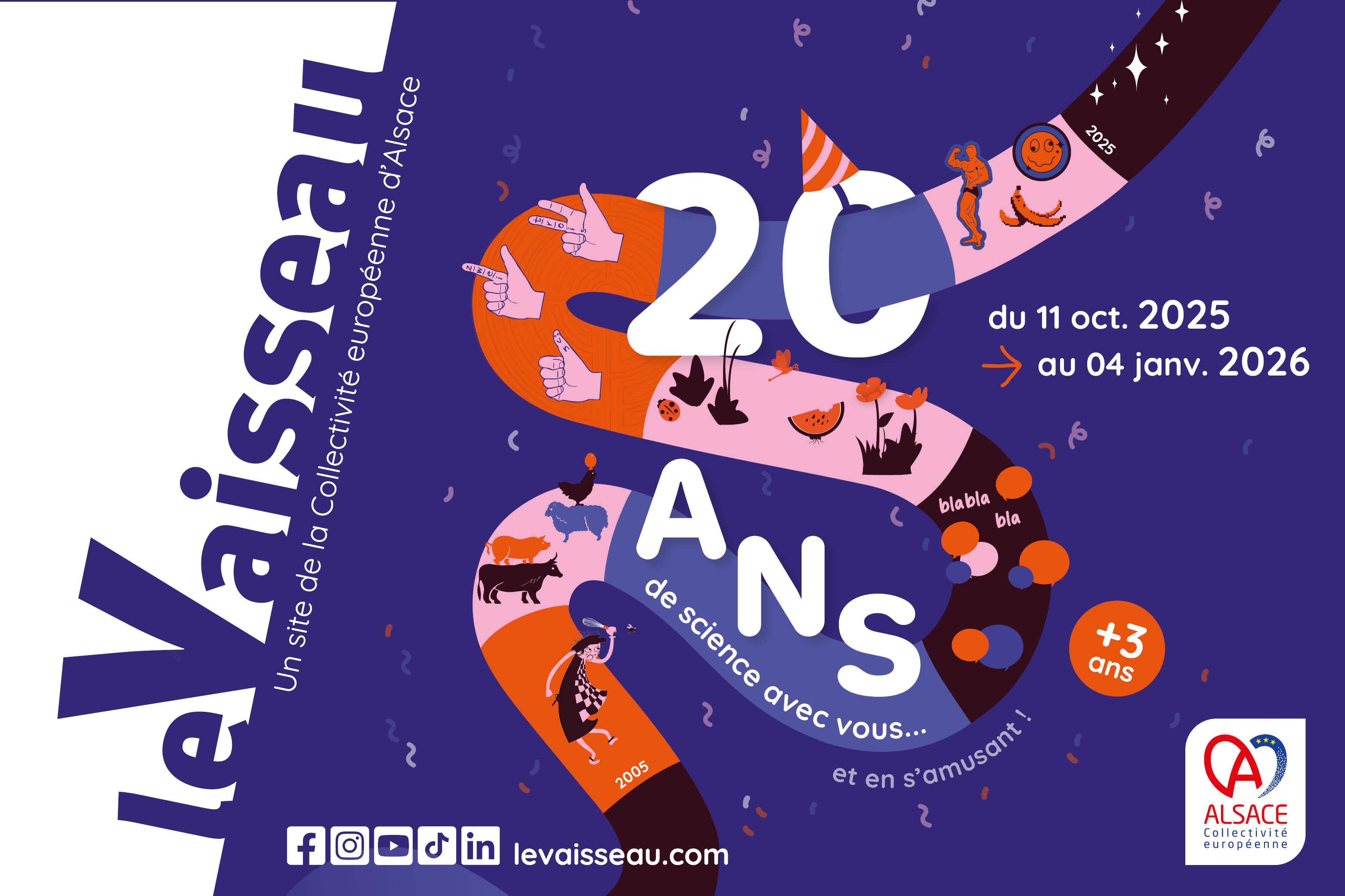 Cette année, le Vaisseau fête ses 20 ans d’aventures scientifiques et vous invite à embarquer pour un voyage dans le temps, à la découverte de ses débuts. Plongez dans une exposition rétrospective et interactive qui vous fera (re)découvrir les moments forts qui ont marqué l’histoire du Vaisseau. Saviez-vous qu’un hamster géant vivait autrefois dans le Jardin ? Vous souvenez-vous du professeur Phénomeno ? Ou encore de l’expérience unique Dialogue dans le noir ? En parcourant cette exposition, replongez dans vos souvenirs, ceux de vos parents ou même de vos grands-parents, et partagez la passion qui a animé des générations. Mais ce voyage dans le passé ne s’arrête pas là ! Le Vaisseau vous invite aussi à envisager son futur. Participez à une construction collective pour imaginer la prochaine exposition ou les futures animations scientifiques. Laissez une trace de votre passage en partageant un souvenir, une anecdote, ou même votre propre histoire : peut-être êtes-vous devenu scientifique grâce à votre visite au Vaisseau ? Rejoignez-nous pour célébrer 20 ans de science, de découvertes et de plaisir partagé en famille !
