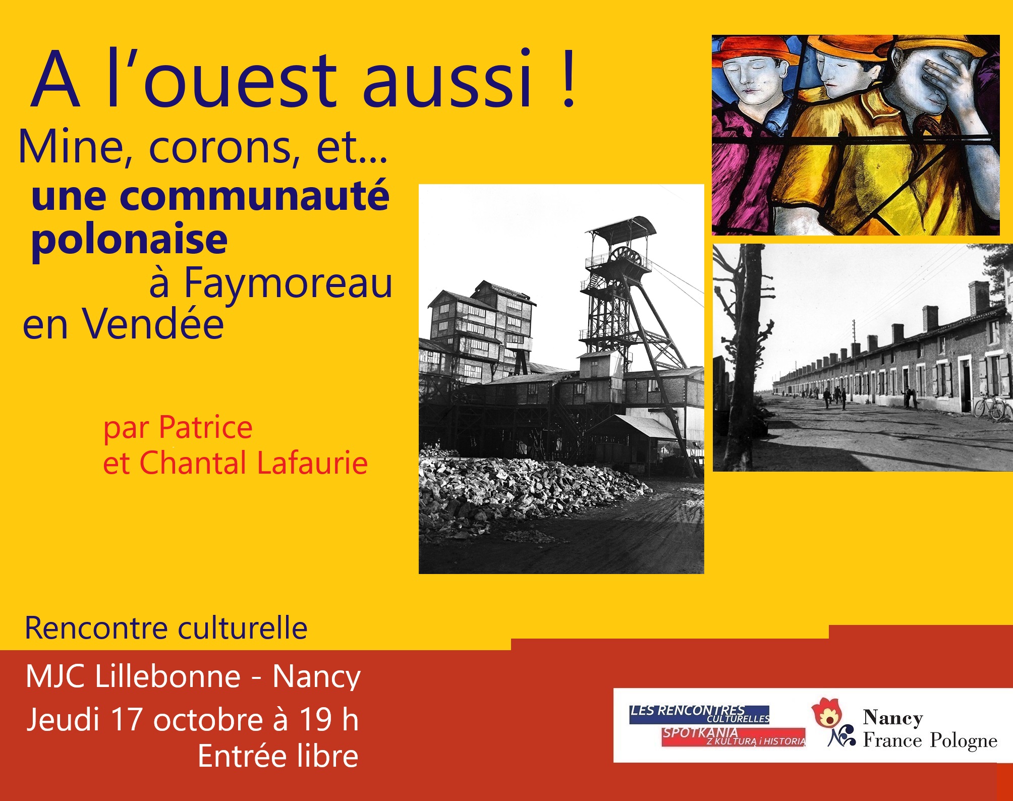 Rencontre culturelle proposée par l’association Nancy France-Pologne. Intervention de Chantal et Patrice Lafaurie. Une découverte du village vendéen de Faymoreau, où l’exploitation du charbon fit appel il y a un peu plus d’un siècle à de la main d’œuvre venue de Pologne. Entrée libre.