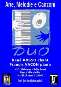 Le duo constitué par René RUSSO, Baryton et Francis Vacon, pianiste nous invite à partager le bonheur de voyager à travers quelques unes des plus belles pages de l’Art lyrique, de la Mélodie française et de la Chanson napolitaine.