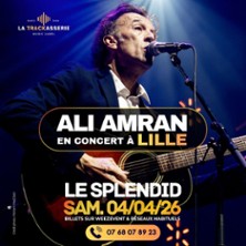 Présenté par La TrackasserieAli Amran poursuit sa tournée et fera étape à Lille pour une date exceptionnelle, dans une configuration intimiste,propice à la proximité et à l’intensité scénique.Reconnu comme un véritable phénomène de scène, Ali Amran propose un concert porté par une formation musicale solide et une mise en espace sobre et immersive, entièrement tournée vers l’interprétation et la relation avec le public. Chaque titre est pensé pour le live, laissant une place centrale à l’émotion, à l’énergie collective et à la transmission.Le concert au Splendidde Lille sera l’occasion de retrouver les titres emblématiques de son répertoire, mais aussi de découvrir quelques nouveaux morceaux de son double EP en cours, révélés progressivement au fil des mois, dont son nouveau tube, Dihin Axir. Une performance où se croisent engagement, puissance musicale et sincérité, dans un format qui met en valeur la force du lien entre l’artiste et son public.Ce rendez-vous lillois s’inscrit dans la continuité d’une trajectoire cohérente et ascendante, confirmant Ali Amran comme un artiste capable d’investir aussi bien les grandes scènes que les salles à taille humaine, avec la même intensité et la même exigence.Guitare et Chant : Ali Amran I Guitare et Bendir : Youva Sid I Guitares : Fabien Mornet I Basse : Daniel Largent IBatterie : Franck Mantegari I Mixage Son : Bob Coke I Lumières : Jalal Akalay