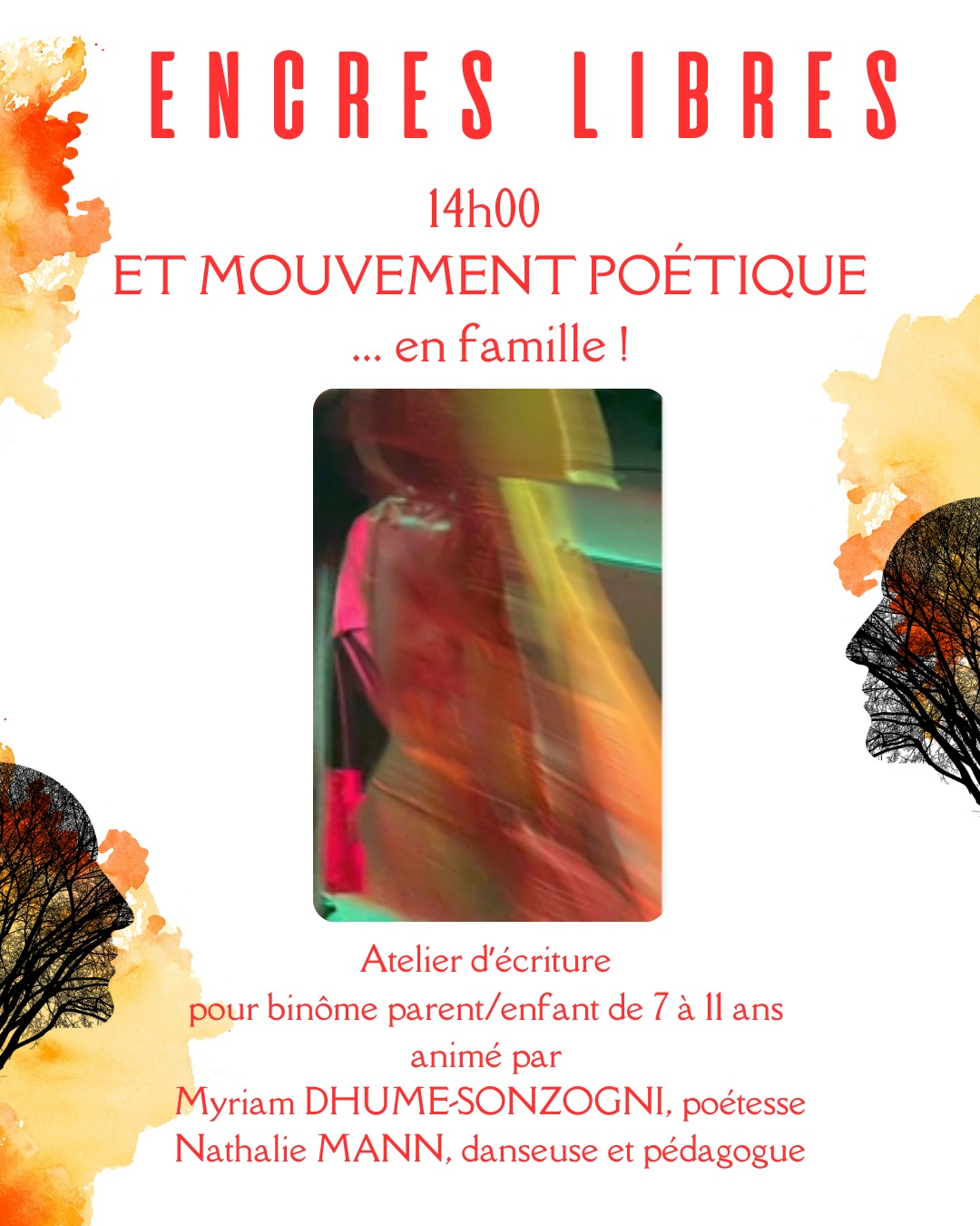 14h00 à 16h00 : …et mouvement poétique, en famille ! // Atelier d’écriture, animé par Myriam Dhume-Sonzogni, poétesse et Nathalie Man, danseuse