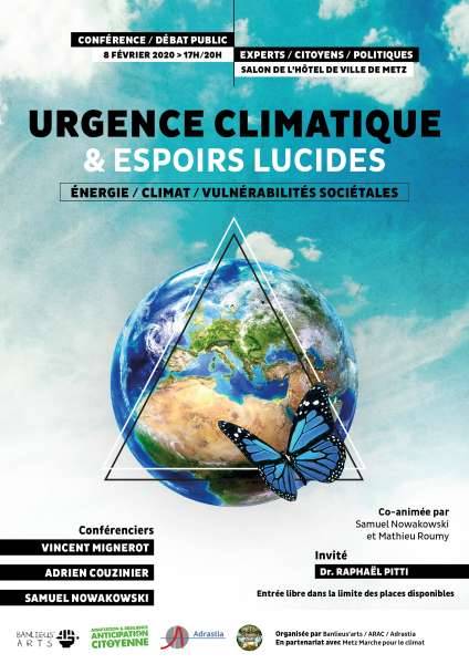 Face à l’urgence de la situation, les associations Banlieus’arts, ARAC (Adaptation & Résilience - Anticipation Citoyenne), Adrastia, en partenariat avec Metz Marche pour le climat, vous propose une grande conférence à l’Hôtel de Ville de Metz ayant pour but d’aborder ces questions à travers un prisme fondamental qui relie experts, citoyens et politiques afin de permettre au plus grand nombre de s’approprier les concepts régissant les mécanismes et le fonctionnement du monde dans lequel nous vivons et faire émerger des axes d’actions et de réflexions futures.