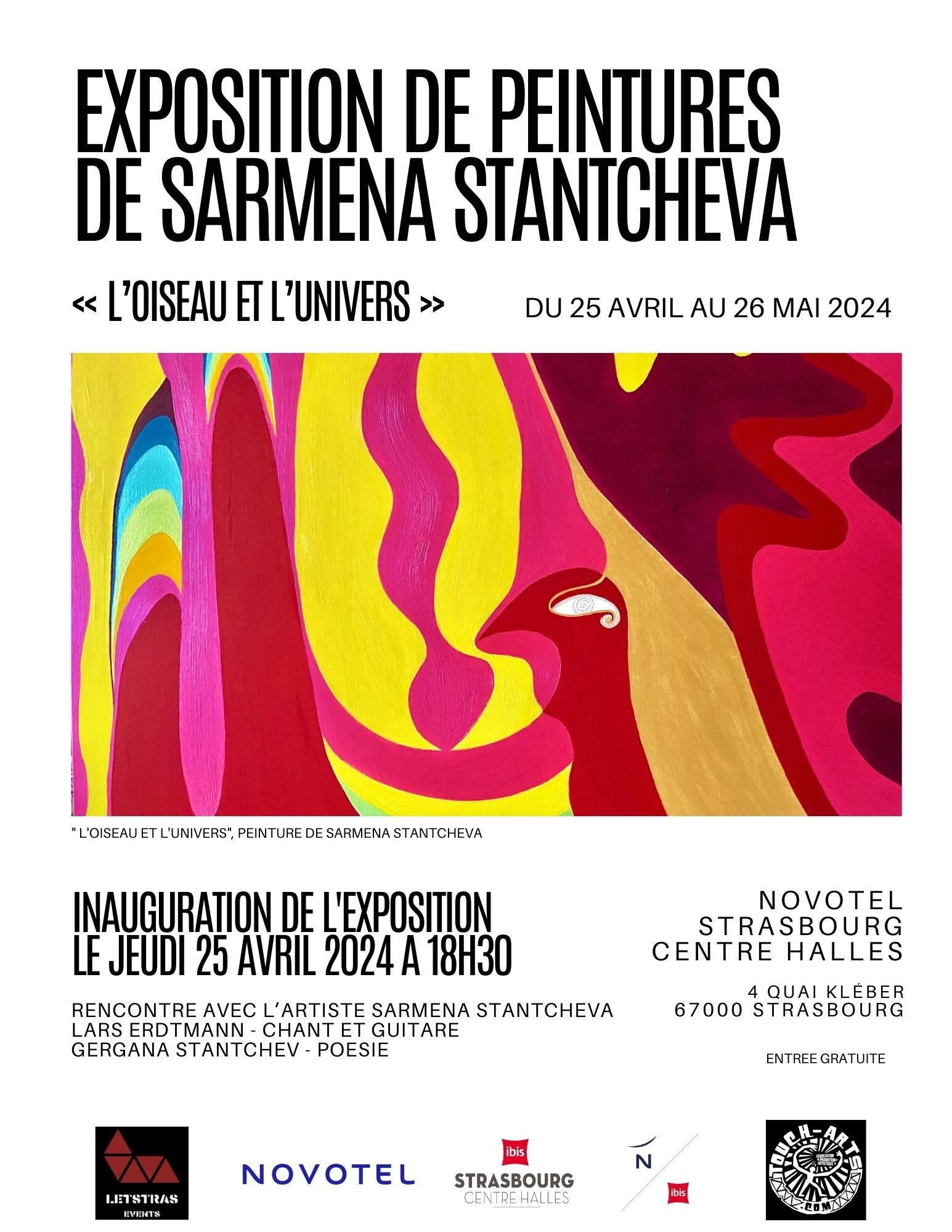 Venez nombreux découvrir une trentaine de toiles de Sarmena STANTCHEVA, artiste peintre, lors d’une exposition qui aura lieu au Novotel-Ibis centre des Halles à Strasbourg du 25 avril au 26 mai 2024. Un vernissage se tiendra le jeudi 25 avril à 18h30 en présence de l'artiste, avec un concert de Lars Erdtmann, guitariste et chanteur et la poésie de Gergana Stantchev.