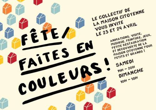 La Fête/Faites en couleurs est organisée pour célébrer la peinture des façades de la Maison Citoyenne. Ce chantier, rendu notamment possible par le don de matériaux d’un peintre en bâtiment, a pour objectif d’ancrer la maison dans le quartier et dans les esprits, autant des habitants que des potentiels financeurs du projet.