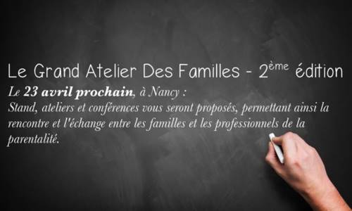 Organisé en partenariat avec l’UDAF 54 et la mairie de Nancy, , le deuxième Grand Atelier Des Familles aura lieu le samedi 23 avril 2016, de 10h à 18h, à la salle des fêtes de Gentilly, à Nancy.