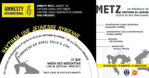 Pour la création de ce spectacle, nos Antennes Jeunes du Lycée Fabert et de l’Université de Lorraine - site de Metz se joignent à l’initiative d’AMNESTY METZ, nous livrant ainsi leurs expressions créatives et inspirantes à l’émouvante histoire d’Haytham.
