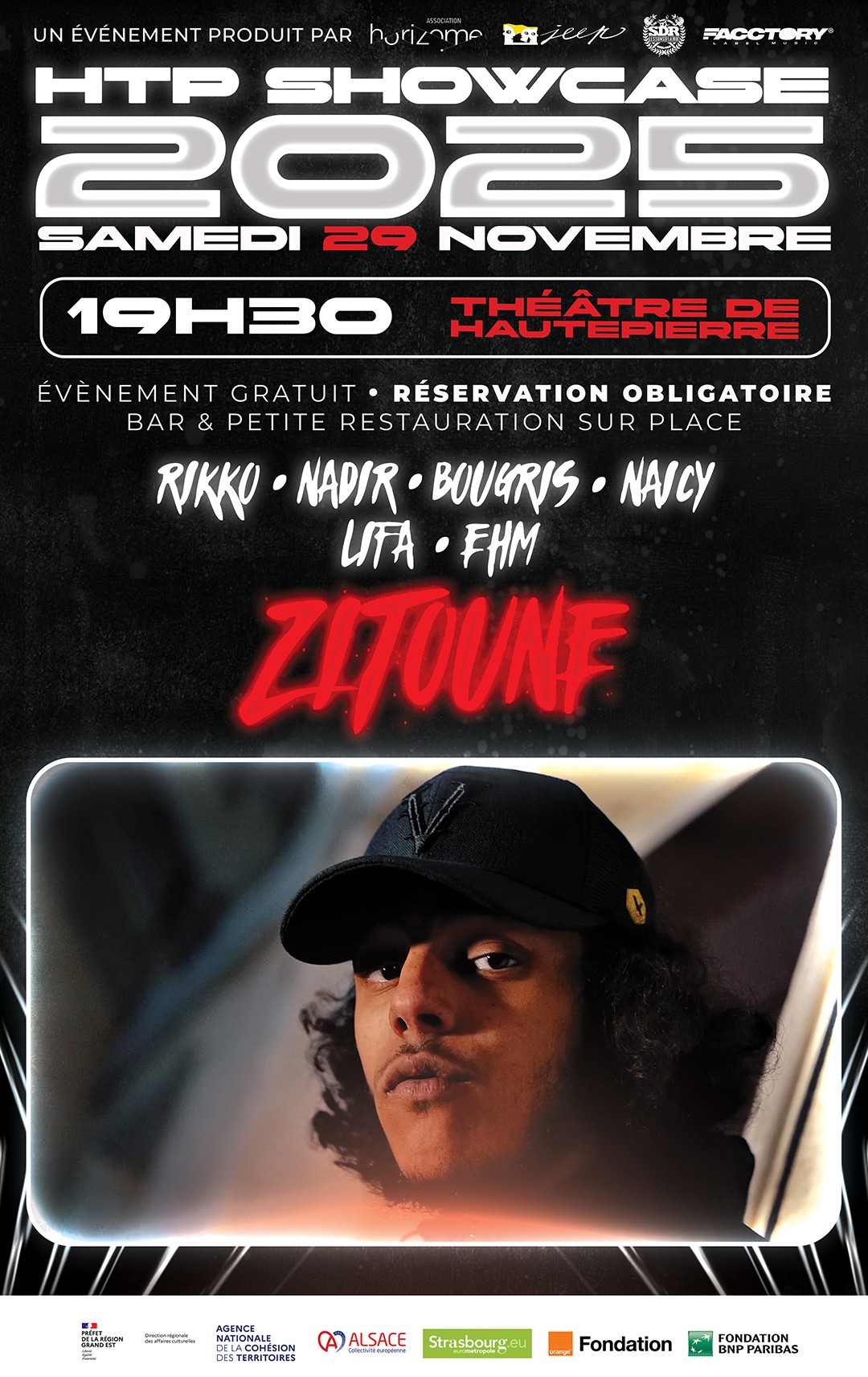Prépare-toi pour une soirée 100% rap ! ZITOUNE débarque sur la scène du Théâtre de Hautepierre pour un show explosif. Avant lui, place à la relève strasbourgeoise : une sélection d’artistes rap locaux viendront chauffer la salle avec leurs sons et leurs univers uniques.