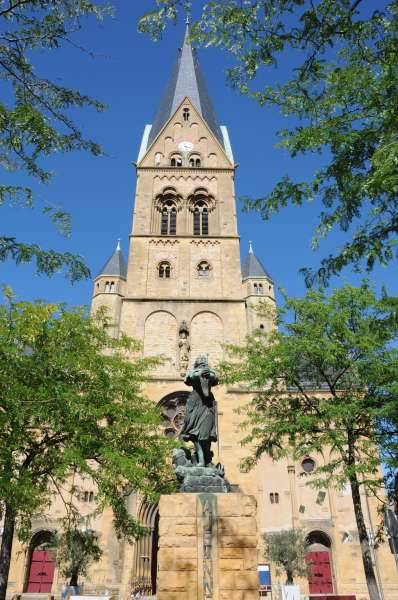 Edifice, en pierre de Jaumont, de plan basilical, avec trois nefs, dans le style néo-roman rhénan. Vitraux réalisés par le maître verrier Martin de Wiesbaden. La construction de l’église est en partie due à l’abbé Philippe Châtelain qui souhaitait disposer d’un lieu de culte à la hauteur de la population catholique en forte augmentation depuis le milieu du XXe s. Après des années de délibérations, le projet de l’architecte originaire de Mayence, Ludwig Becker, fut retenu. La première pierre fut posée le 3 mai 1903. L’église fut inaugurée, après trois années de travaux, le 29 juillet 1906 par Monseigneur Benzler, évêque de Metz. La façade de l’église donnant sur la place Jeanne d’Arc est percée de trois portes dont le grand portail surmonté de la statue de saint Joseph, patron de l’église. Grande variété de fresques qui s’organisent en cinq grands programmes. A noter : la représentation de nombreux dragons sur les stalles, sur le baldaquin, dans les verrières, et même des plus petits sur les chapiteaux. L’église renferme également des vestiges des anciennes églises de Montigny, dont un admirable christ en bois du XVe s. et une statue de saint Privat, qui se trouvaient dans l’église dédiée à ce martyr.