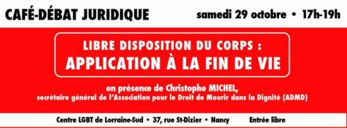 Le Centre LGBT accueillera samedi 29 octobre l’ADMD, Association pour le Droit de Mourir dans la Dignité, qui milite pour que chacun-e puisse choisir les conditions de sa propre fin de vie, conformément à ses conceptions personnelles de dignité et de liberté.