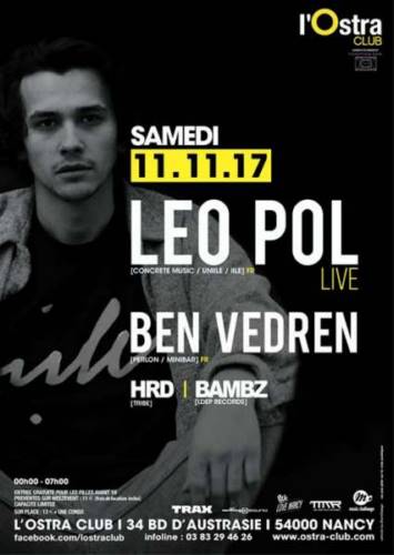 Samedi 11 novembre nous recevons Leo pol en live, nouvelle recrue CONCRETE et valeur montante de la scène house française. Il sera accompagné du talentueux dj/producteur français Ben Vedren.