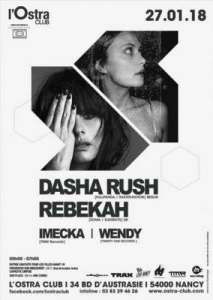 Nous démarrons 2018 sur les chapeaux de roues puisque nous recevons le 27 janvier : REBEKAH l’anglaise férue de techno puissante et la très respectée productrice russe DASHA RUSH