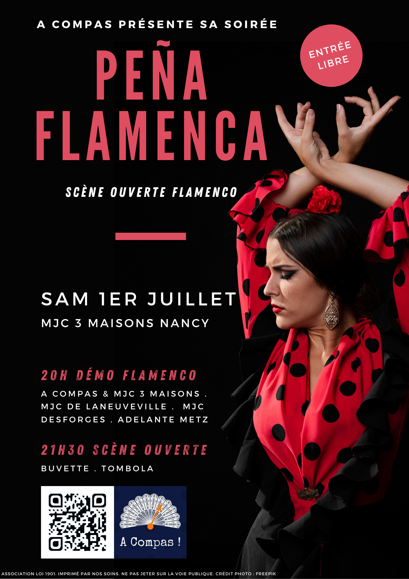 - Dès 20h, Démo des écoles de Flamenco : A Compas invite les écoles de la région à présenter pour une démo exceptionnelle d'1h30 ! Vous aurez le plaisir de découvrir les chorégraphies des écoles A Compas (Nancy et Laneuveville), MJC Desforges (Nancy) et Adelante (Metz).