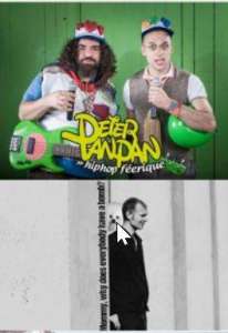 Sébastien Coste, Camille Perrin. Après une adolescence très lucrative sur les scènes de musiques expérimentales, la voix de la sagesse a remis Peter et Panpan sur les rails du Hip Hop. À gorges déployées, ces deux bouffons délivrent leur message et balance un répertoire qui allie bon groove, humour et improvisations telluriques, même si au final… on assiste plutôt à une énorme Farce Musicale."Les enfants adorent car ça sent l’adolescence et les adultes en redemandent car ça sent l’enfance !" – Dixit DJ Guetta