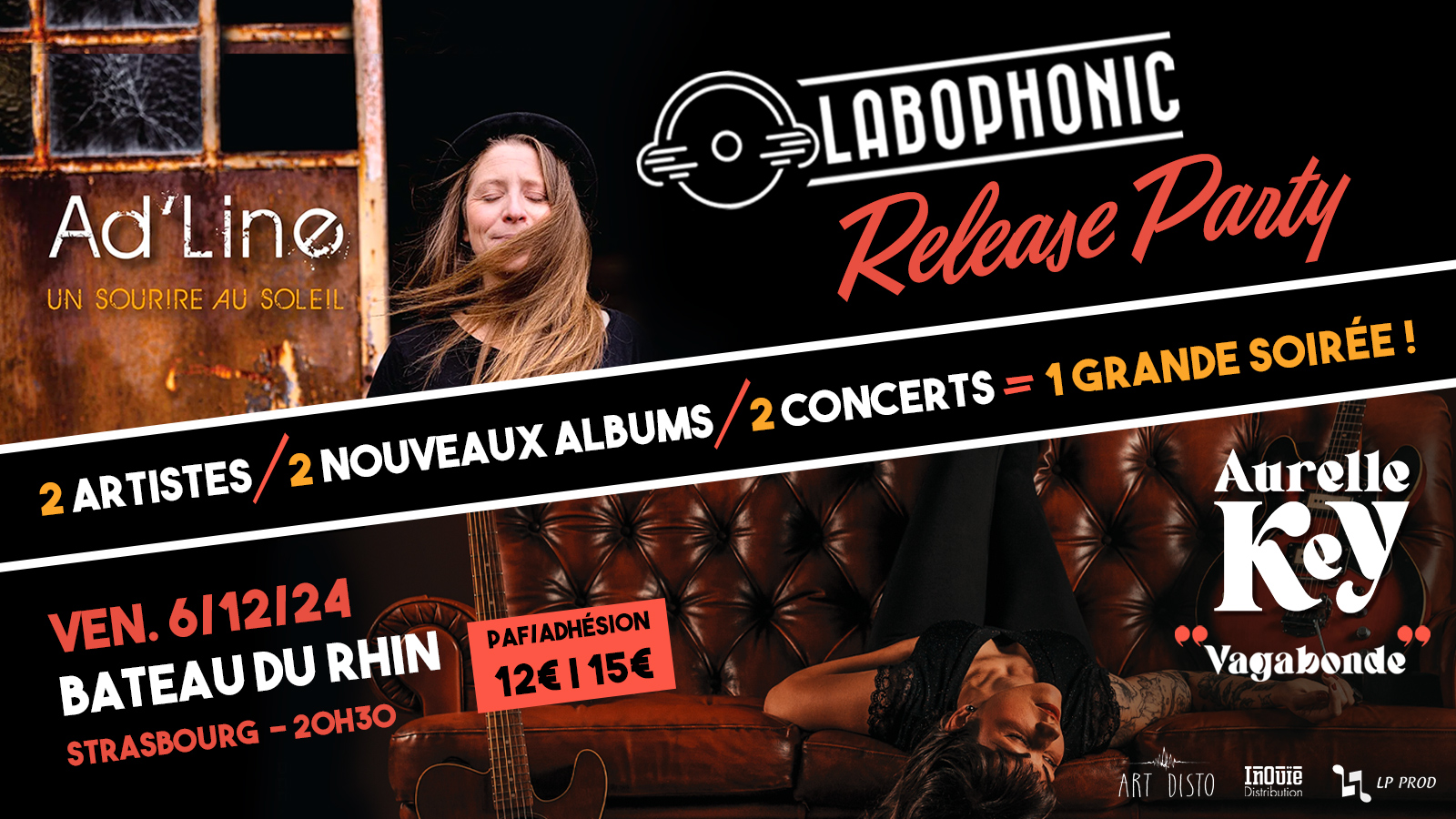 Labophonic et LP Prod présentent une soirée exceptionnelle au Bateau du Rhin à Strasbourg : la release party des talentueuses Ad'Line et Aurelle Key. Samedi 6 décembre 2024, le restaurant du Port du Rhin se transformera en une véritable scène musicale pour célébrer la sortie des nouveaux albums de ces deux artistes.