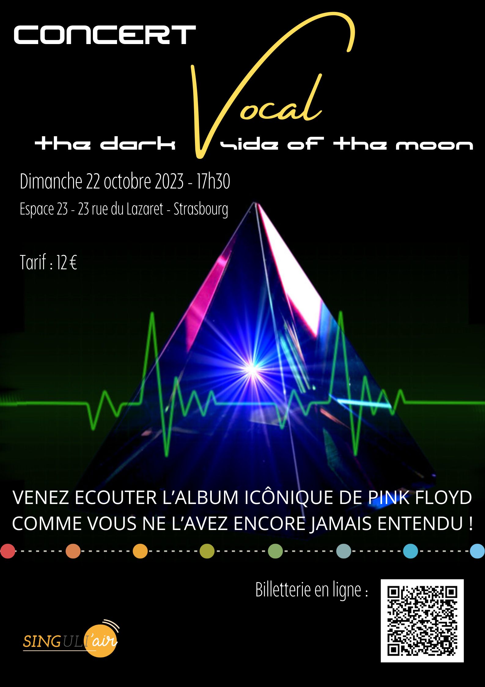Venez assister à cette adaptation pour choeur, originale et inédite, de l'album icônique de Pink Floyd "The dark side of the moon". Un concert qui vous permettra de redécouvrir cette oeuvre et de l'écouter comme vous ne l'avez encore jamais entendue !
