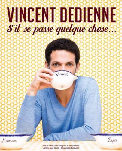 Bonjour ! Je m’appelle Vincent Dedienne et je suis la personne qui boit un chocolat chaud/thé vert bio/soupe à l’oignon sur l’affiche !