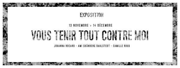 – du 7 au 14 décembre, et ouvre ses portes de 14h à 18h en semaine.Vous tenir tout contre moi réunit des œuvres de Johanna Rocard, Camille Roux et Ami Skanberg Dahlstedt.