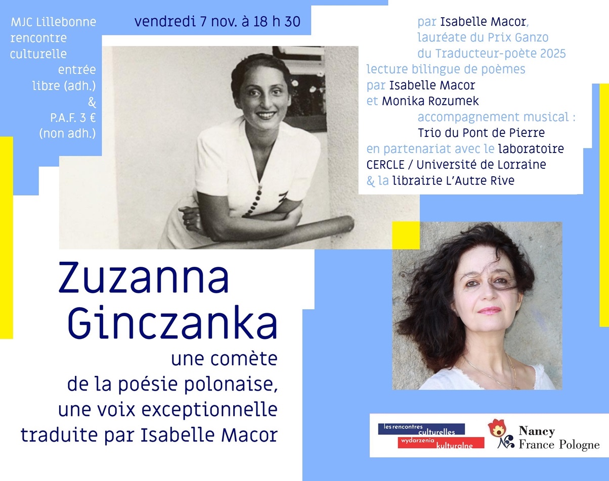 Pour cette première rencontre culturelle de la saison, l’association Nancy France-Pologne a le plaisir et l’honneur d’accueillir Isabelle Macor, qui vient d’être lauréate (session automne 2025) du Prix de Poésie Robert Ganzo, dans la catégorie Traducteur-poète. La soirée mettra en valeur les poèmes de Zuzanna Ginczanka, et sera rythmée par des lectures bilingues par Isabelle Macor et Monika Rozumek, ainsi que des illustrations musicales par le Trio du Pont de Pierre (avec Régine Colin au piano et violoncelle, Christiane Galeski-Wild au violon et Alain Quéré à l’alto).