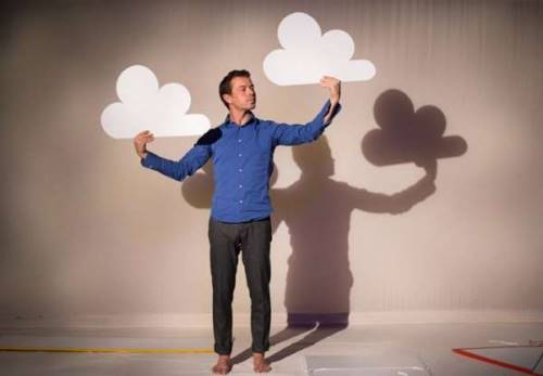 À l’ombre d’un nuage, c’est la présence d’un personnage singulier, manipulateur, jongleur, tenant dans ses mains un très grand livre. À l’ombre d’un nuage, c’est ce livre qui prend vie, en musique et en image et l’approche singulière de l’illustrateur Vincent Godeau , invité à Schilick on carnet en novembre 2017, offre un décor coloré et ludique à cette odyssée.