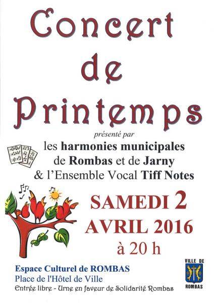 "Concert de Printemps" avec les harmonies municipales de Rombas (La Concordia) et de Jarny sous la direction de Patrick Peltier et l’Ensemble vocal Tiff Notes dirigé par la chef de chœur Mylène Wuillaume.