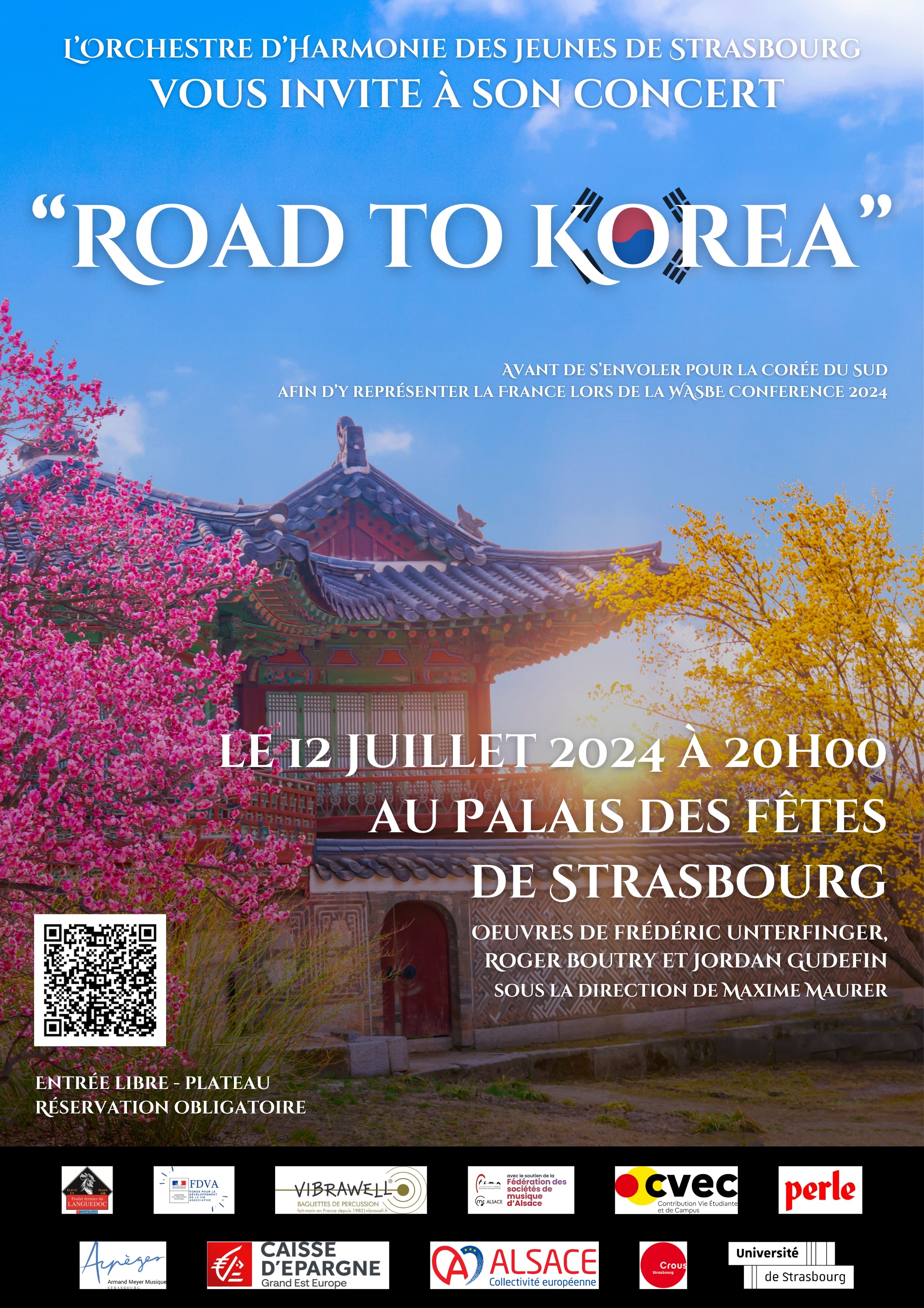 L'Orchestre d'Harmonie des Jeunes de Strasbourg (OHJS) organise un concert le vendredi 12 juillet à 20h au Palais des fêtes de Strasbourg, 2 jours avant de s'envoler en Corée du Sud pour représenter la France lors de la WASBE* Conference. (*World Association for Symphonic Bands and Ensembles, association mondiale des orchestres d'harmonie).