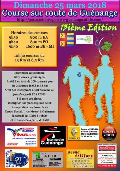 Droit d’inscription 10 € pour la course des 6,5 et 13 Km dont 1 € reversé à l’association "Handi-relais" de Guénange qui s’occupent de personnes handicapés.