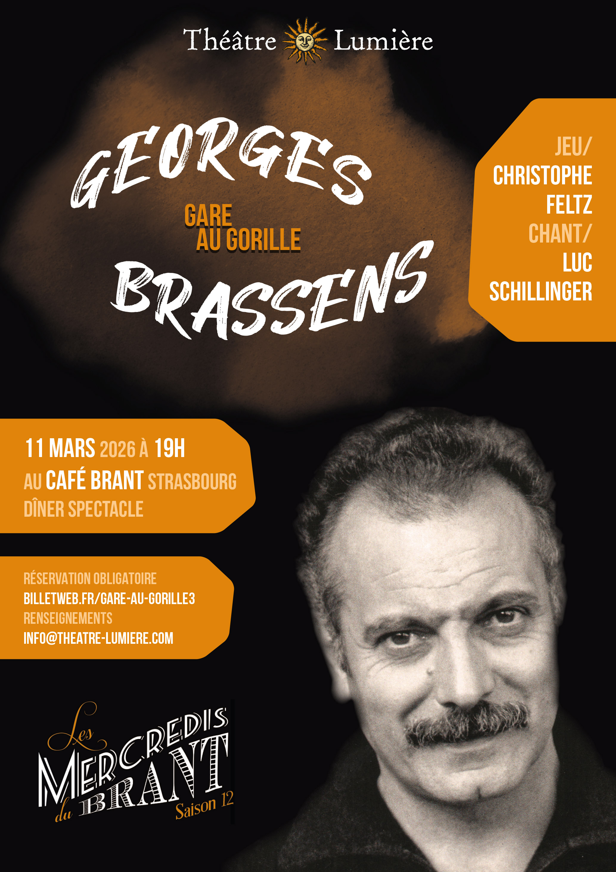 Dîner-spectacle de théâtre musical « Gare au Gorille » d’après Georges Brassens, avec Christophe Feltz (jeu) et Luc Schillinger (guitare & chant) le mercredi 11 mars 2026 à 19h au Café Brant à Strasbourg.